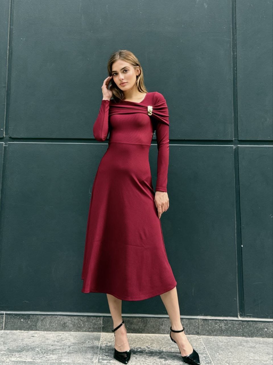 Faites une entrée remarquée avec cette robe bordeaux au charme sophistiqué. Sa coupe mi-longue et ses manches longues offrent une silhouette structurée et féminine, tandis que le drapé subtil au col et l’ornement doré à l’épaule ajoutent une touche de luxe discrète.